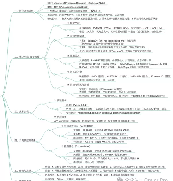 从文献中提取此类关系面临诸多挑战,例如:需要自动化处理全文内容、整合生物术语的多种同义表达形式,以及部署复杂的自然语言处理和机器学习模型。为降低技术门槛并提升可访问性,研究人员开发了一个名为 DancePartner 的 Python 软件包。该工具能够从科研文献和现有数据库中高效提取生物分子间的功能关系,支持将不同命名的同义词映射至标准标识符,并具备构建与可视化多组学网络的能力。