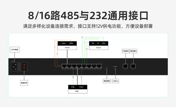 设备提供8路独立RS485/232串行接口,每路均支持DC12V/500mA对外供电,可同时连接PLC、传感器、门禁控制器等多种工业终端,满足现场多设备集中联网的需求。串口波特率范围覆盖300bps至115200bps,具备自适应能力,兼容主流工业通信协议,保障各类老旧设备无需改造即可顺利接入现代网络体系。