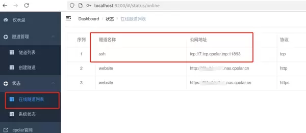 接着进入“在线隧道列表”,即可查看当前 SSH 服务所分配的临时公网地址信息。