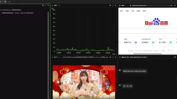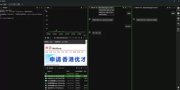 初次启动时,界面左侧默认显示命令行操作区域,中间部分集成了 CPU 使用监控、内置浏览器和本地文件浏览模块,右侧则提供帮助信息及 AI 对话窗口。所有模块均可根据个人习惯自由拖动、拆分、新增或关闭。