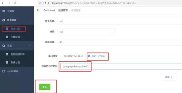 在编辑页面中修改配置信息,将之前保留的固定 TCP 地址应用到当前隧道: