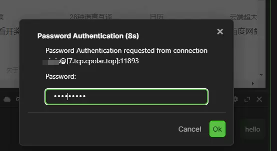 随后输入对应的用户名和密码,即可通过 Cpolar 生成的公网地址完成 SSH 远程连接。