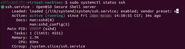 若返回结果显示为绿色“active (running)”,表示 SSH 服务已成功启动。