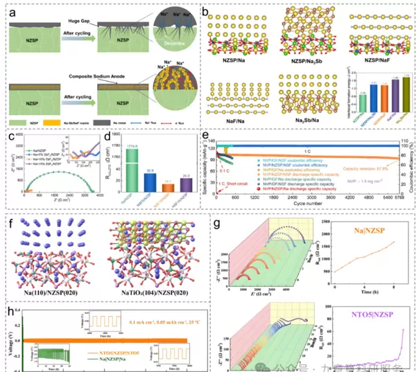 图8. 固态电解质与负极间界面形成能的评估。(a)Na/NZSP与NSF/NZSP界面接触示意图;(b)基于DFT计算的界面形成能对比图;(c)对称电池的EIS谱图;(d)面积比电阻比较;(e)循环稳定性测试结果;(f)DFT计算所得界面形成能数据;(g)Na|NZSP|Na与NTO5|NZSP|NTO5对称电池的GEIS谱图;(h)恒电流充放电循环性能曲线。