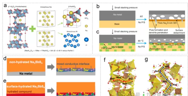 图9. 氧化物与硫化物固态电解质在钠负极界面的钠离子传输机制。(a)界面反应模型;(b)BASE电解质;(c)YSZ涂层修饰的YSZ@BASE复合电解质界面构建过程;(d)非水合NaSbS与(e)表面水合NaSbS的界面层结构;(f)NaSbS·8HO与(g)NaSbS·9HO中钠空位的迁移路径模拟。