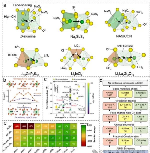 尽管全固态钠电池的工作机理与锂体系相似,但其固态电解质的设计原则存在本质差异。通过对氧化物、硫化物、卤化物等体系的对比分析可知,钠离子与锂离子在晶体结构偏好和扩散行为上表现出明显不同。例如,共面高配位数位点的独特构型为钠离子提供了等效有利位置间的直接迁移通道,该路径具有较小的配位数波动和较大的瓶颈尺寸,因而形成较低的迁移能垒特性,如图3所示。