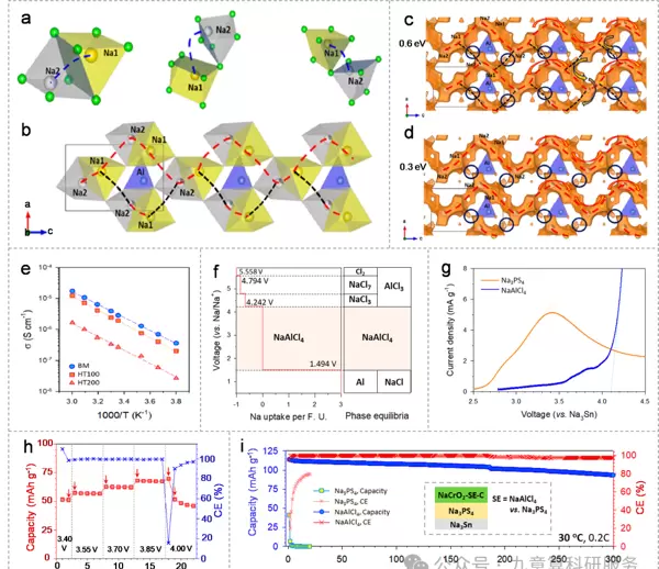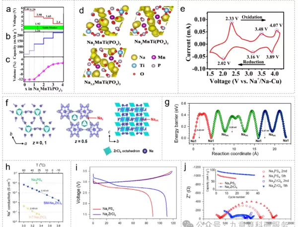 图7. 全固态钠电池中固态电解质与高压正极间的兼容性及钠离子传输特性。(a)NaMnTi(PO)相对于Na/Na的电压平台;(b)理论比容量;(c)体积变化率;(d)Na迁移轨迹;(e)循环伏安曲线;(f)NaZrCl中Na扩散路径的可视化结果;(g)相应的能量拓扑图;(h)BM-与HT-NaZrCl离子电导率的阿伦尼乌斯曲线;(i)首周充放电曲线;(j)对应的交流阻抗谱。