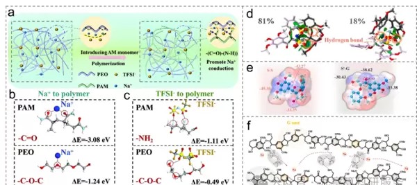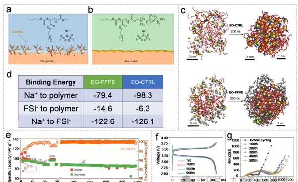 图10. 聚合物固态电解质与钠负极界面的分子动力学模拟结果。(a, b)SEI膜形成的机理分析;(c)原子尺度下的动力学演化过程;(d)结合能计算结果;(e)倍率性能表现;(f)充放电曲线;(g)电化学阻抗谱。