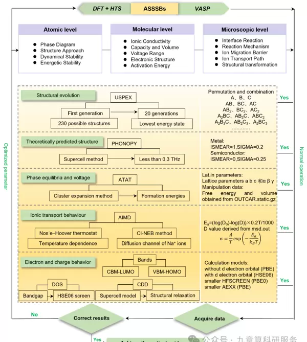 理论计算在揭示材料微观机制方面发挥着不可替代的作用,能够精准预测原子级、分子级乃至介观尺度下的物理化学性质(见图2)。基于密度泛函理论(DFT)的VASP软件,结合高通量筛选(HTS)技术,可用于大规模评估候选材料的结构特征、离子输运机制及综合性能表现。高通量方法广泛应用于晶体结构识别、扩散路径优化和性能参数预测等领域,显著提升了新材料发现效率。