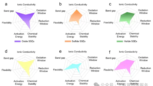 各类固态电解质在离子电导率、氧化/还原稳定性窗口、化学惰性、活化能、机械柔韧性及带隙等方面各有特点,适用场景也有所不同。图4通过雷达图形式直观呈现了不同类型电解质的关键理论参数对比,包括氧化物、硫化物、卤化物、硼氢化物、聚合物以及无机–有机复合型固态电解质的综合性能分布。