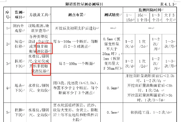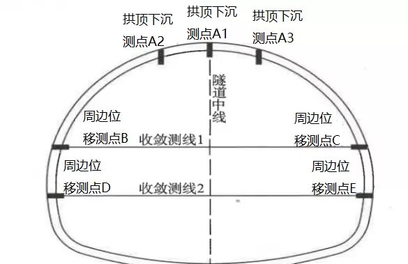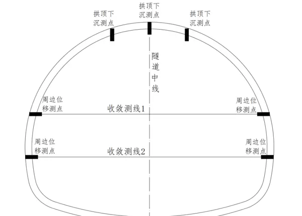 - 拱顶下沉:每断面布设2~3个测点,其中一点位于拱顶中线,两侧分别距中线2~3米处各设一点。