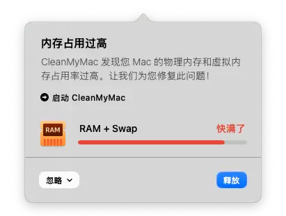 更贴心的是它的“通知提醒”机制:当系统数据占用过高或内存不足时,会主动弹窗提示。只需点击“释放”,即可快速释放资源,从根本上缓解苹果电脑系统数据过多的问题。