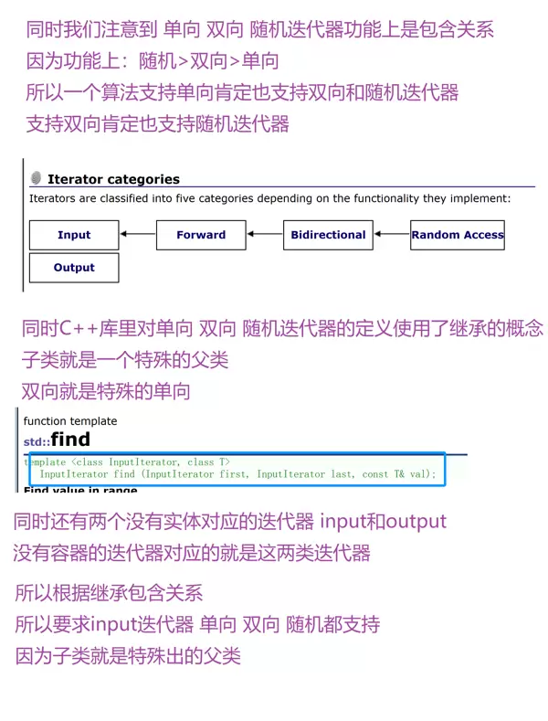 此外,在 C++ 标准库中,迭代器的分类采用了继承机制来表达不同类型之间的关系,即更具体的迭代器类型通过继承自较通用的基类来实现。这种设计体现了“子类是一种特殊的父类”的面向对象原则。
