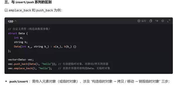 此外,emplace 系列还支持传递构造参数,适用于自定义类型的对象构建。