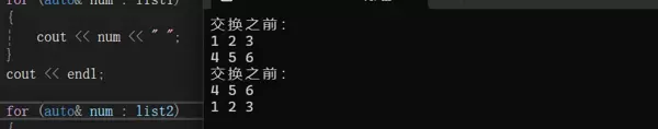 list 中的 swap() 函数与 vector、string 中的 swap 类似,主要通过交换内部指针完成两个容器内容的互换,执行效率非常高。
