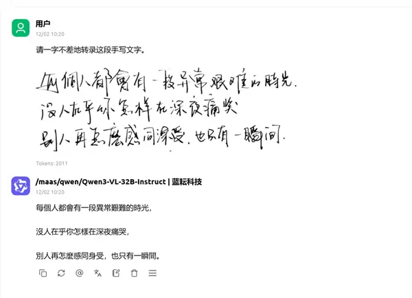 结果表明,Qwen3-VL-32B-Instruct在面对非标准字体时表现出极强稳定性。即使字迹不清或存在明显连笔,模型仍能借助上下文语义进行纠错,最终输出准确文本。这得益于其大规模训练数据集和先进的视觉编码架构,使其具备从噪声中有效提取关键特征的能力。