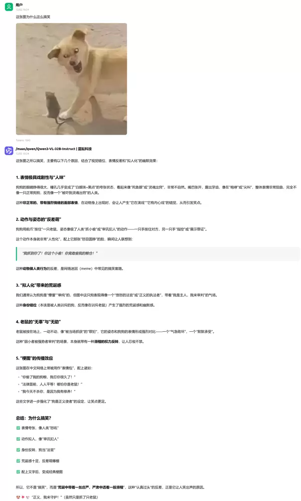 模型不仅能识别图中物体与人物动作,更关键的是,它捕捉到了因违背常识而产生的荒诞性冲突。通过对异常组合的分析,模型用自然流畅的语言解释了笑点来源,说明其已实现视觉信号与抽象语义之间的高阶对齐,具备初步的情境理解能力。