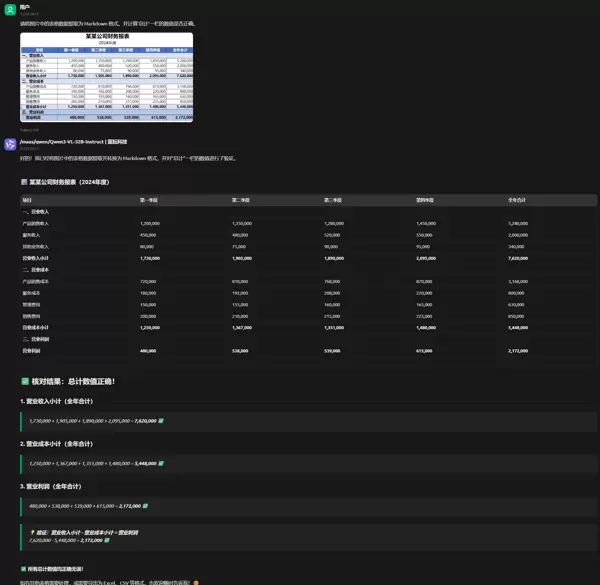 输出结果显示,Qwen3-VL-32B-Instruct成功还原了完整的表格结构,所有单元格内容均被正确提取,未出现遗漏或错位。更重要的是,模型自主完成了加法校验,并确认原始总计数值无误。这种能力在财务审计、票据自动化等高精度场景中具有重要应用价值。