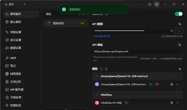 当界面显示绿色的成功提示时,表示网络链路畅通、鉴权有效,模型已准备就绪。这标志着本地开发环境已成功对接云端强大算力资源。