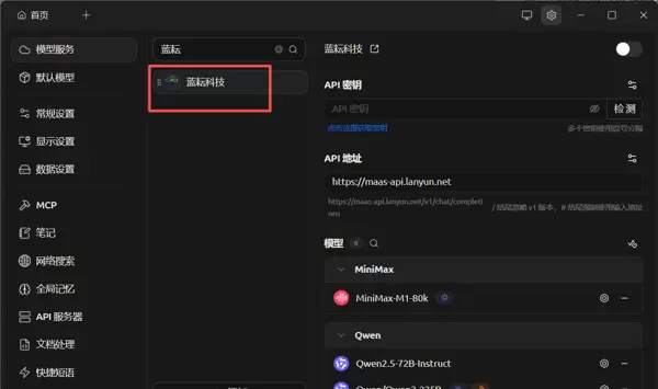 启动Cherry Studio后,进入设置界面。在“模型提供商”配置区域,可通过搜索快速定位到“蓝耘”服务商。该设计简化了手动配置流程,客户端内置的预设模板能够自动适配蓝耘平台的API通信协议。