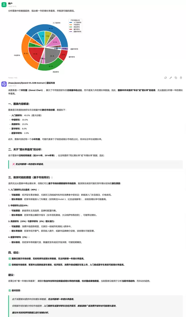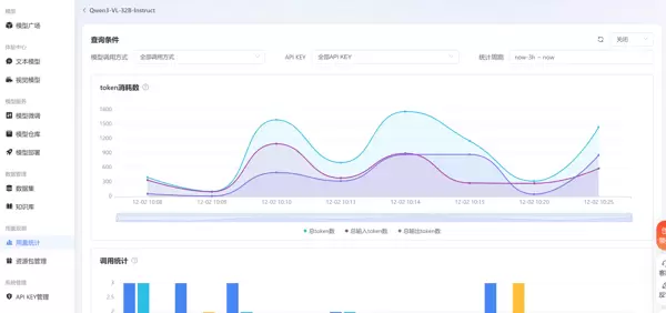 通过蓝耘平台的监控界面可直观查看资源消耗情况。Qwen3-VL-32B-Instruct在接近旗舰级表现的同时,Token使用量维持在合理区间,体现出良好的性价比控制。