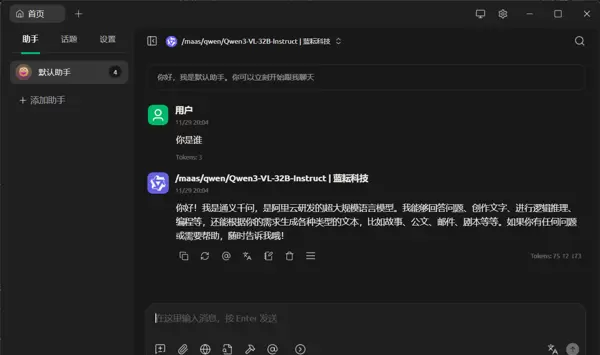 为初步验证连接有效性,可输入基础指令“你是谁”。若模型能准确回应自身身份信息并给出清晰的自我介绍,则说明其文本生成能力和指令对齐机制均正常工作。