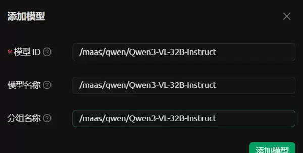 任何字符缺失或拼写错误均可能导致调用失败。模型名称可自定义,建议设置为易于识别的形式,例如“Qwen3-VL-32B”。