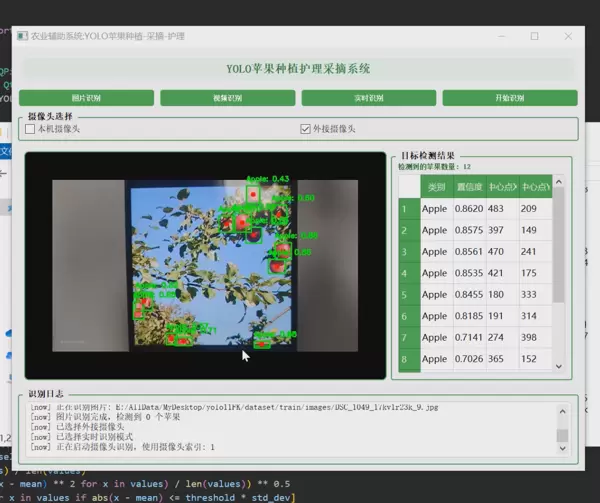 本系统是一款面向智慧农业场景的苹果采摘辅助工具,依托计算机视觉与深度学习技术,实现对苹果位置的精准检测与实时定位。系统采用YOLO(You Only Look Once)目标检测模型作为核心算法,结合PyQt5开发图形交互界面,支持三种工作模式:图片识别、视频流识别以及实时摄像头输入识别,满足多样化应用场景需求。