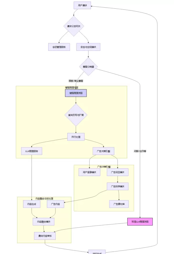 该架构的核心创新点在于引入了 **“意图分类器”** ——作为流量的第一道分拣节点,判断用户查询是否具备商业转化潜力。对于被标记为具有商业意图的请求,系统将启动“增强推理流程”,激活广告决策引擎参与响应生成。