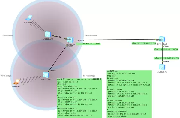 <AC6605>sys Enter system view, return user view with Ctrl+Z. [AC6605]undo info-center enable Info: Information center is disabled. [AC6605]sysname AC [AC]vlan 99 Info: This operation may take a few seconds. Please wait for a moment...done. [AC-vlan99]interface Vlanif99 [AC-Vlanif99]ip address 10.0.99.254 255.255.255.0 [AC-Vlanif99]interface GigabitEthernet0/0/1 [AC-GigabitEthernet0/0/1]port link-type access [AC-GigabitEthernet0/0/1]port default vlan 99 [AC-GigabitEthernet0/0/1]quit [AC]quit <AC>save