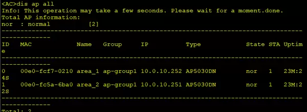 [AC-wlan-view]ap auth-mode mac-auth [AC-wlan-view]ap-id 0 ap-mac 00e0-fcf7-0210 [AC-wlan-ap-0]ap-name area_1 [AC-wlan-ap-0]ap-group ap-group1 Warning: This operation may cause AP reset. If the country code changes, it will clear channel, power and antenna gain configurations of the radio, Whether to c ontinue? [Y/N]:y Info: This operation may take a few seconds. Please wait for a moment.. done. [AC-wlan-ap-0]qu [AC-wlan-view]ap-id 1 ap-mac 00e0-fc5a-6ba0 [AC-wlan-ap-1]ap-name area_2 [AC-wlan-ap-1]ap-group ap-group1 Warning: This operation may cause AP reset. If the country code changes, it will clear channel, power and antenna gain configurations of the radio, Whether to c ontinue? [Y/N]:y Info: This operation may take a few seconds. Please wait for a moment.. done. [AC-wlan-ap-1]qu [AC-wlan-view]dis ap all[AC-wlan-view]security-profile name wlan-net1 [AC-wlan-sec-prof-wlan-net1]security wpa-wpa2 psk pass-phrase abc12345 aes [AC-wlan-sec-prof-wlan-net1]qu [AC-wlan-view]ssid-profile name wlan-net1 [AC-wlan-ssid-prof-wlan-net1]ssid Sales Info: This operation may take a few seconds, please wait.done. [AC-wlan-ssid-prof-wlan-net1]qu [AC-wlan-view]vap-profile name wlan-net1 [AC-wlan-vap-prof-wlan-net1]forward-mode direct-forward [AC-wlan-vap-prof-wlan-net1]service-vlan vlan-id 11 [AC-wlan-vap-prof-wlan-net1]security-profile wlan-net1 Info: This operation may take a few seconds, please wait.done. [AC-wlan-vap-prof-wlan-net1]ssid-profile wlan-net1 Info: This operation may take a few seconds, please wait.done. [AC-wlan-vap-prof-wlan-net1]qu [AC-wlan-view]security-profile name wlan-net2 [AC-wlan-sec-prof-wlan-net2]security wpa-wpa2 psk pass-phrase abc12345 aes [AC-wlan-sec-prof-wlan-net2]qu [AC-wlan-ap-group-ap-group1]regulatory-domain-profile default Warning: Modifying the country code will clear channel, power and antenna gain c onfigurations of the radio and reset the AP. Continue?[Y/N]:y [AC-wlan-ap-group-ap-group1]qu