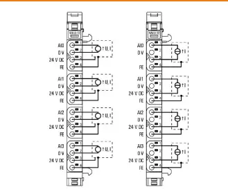 以下以典型数字量输入模块 UR20-16DI-DO-24DC-SC 与模拟量输入模块 UR20-4AI-4MA-12BIT 为例说明具体接线方式。