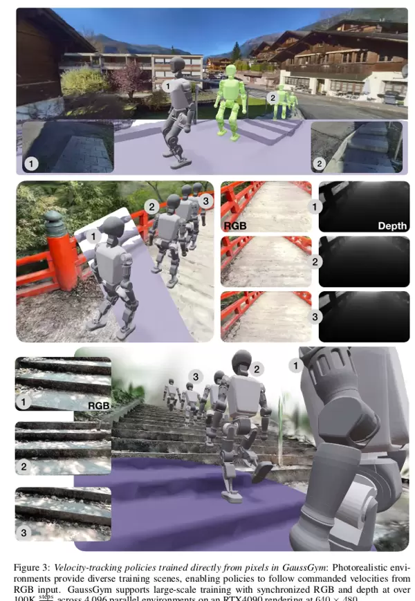 为了验证 GaussGym 在训练“视觉-运动”策略方面的能力,研究者针对双足(类人)和四足(如狗形)机器人设计并训练了移动与导航策略。尽管 GaussGym 具备更高的仿真速度和更逼真的画面表现,但从原始 RGB 像素中直接学习仍面临巨大挑战。这是因为策略网络必须从二维图像中自行推断出三维空间结构信息——例如地面高度、障碍物形态等,而无法像传统方法那样依赖已有的深度图或高程图作为输入。