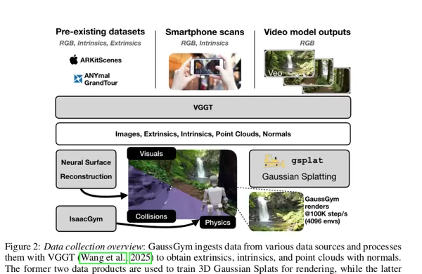 如图所示,GaussGym支持多种输入形式,包括带位姿标注的数据集、智能手机扫描结果或由视频生成模型输出的RGB图像序列。所有输入均通过VGGT网络进行标准化处理,统一估计相机内参、外参、密集点云及表面法线信息。