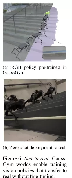 实验进一步表明,仅在 GaussGym 中基于纯视觉输入训练出的策略,无需任何真实机器人上的微调,即可成功部署于实体机器人进行楼梯攀爬测试,并取得初步成果。这标志着在缩小视觉仿真与现实之间差距的方向上迈出了关键一步。同时,GaussGym 降低了高保真仿真技术的应用门槛,为未来视觉驱动的移动与导航研究提供了坚实平台。
