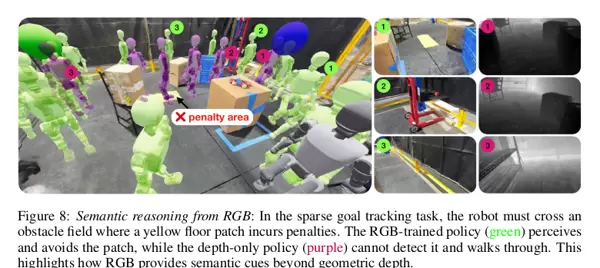 - 通过“到达指定目标点”任务验证:仅基于 RGB 图像训练的导航策略展现出一定的语义理解能力。它能够主动避开某些视觉上“不适宜通行”的区域(如地毯边缘、反光地板),而这类信息对于仅依赖深度感知的策略而言是完全不可见的。