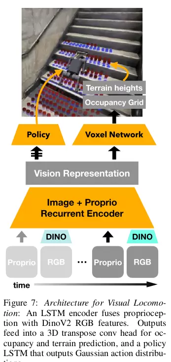 随后,将上述生成的视觉嵌入?与当前时刻的本体感觉测量值?进行拼接,形成一个联合特征向量。该向量作为输入传递给LSTM单元。得益于LSTM的“记忆”机制,它不仅能响应当前输入,还能保留并利用历史信息,从而有效建模时序依赖关系。最终输出的是一个紧凑的潜在表示,综合了过往的视觉语义和本体感觉状态,构成了对当前整体环境与机器人自身状态的高度抽象概括。