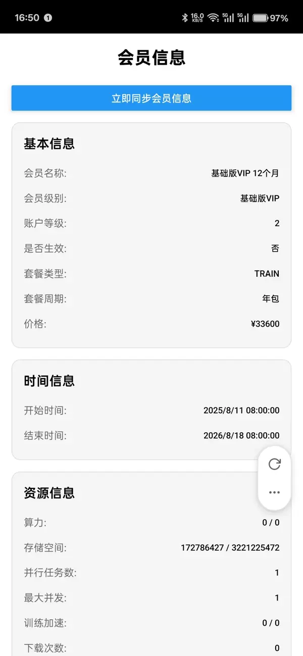 展示当前用户的 VIP 会员详细信息,包含会员等级、套餐类型、生效状态、有效期、资源使用统计等内容。