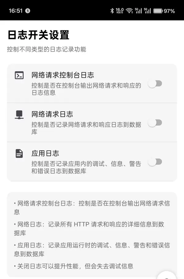 - 开关控制:提供 UI 开关,允许开发者按需开启或关闭日志记录,在生产环境默认关闭。