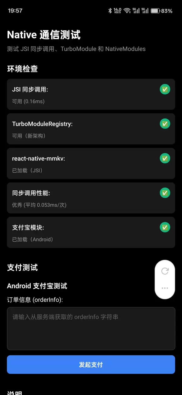 功能可用性验证:对支付等核心原生功能进行实际调用测试,确认其工作正常。
