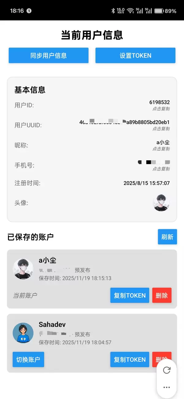 提供当前登录用户的完整资料展示,涵盖用户 ID、UUID、昵称、手机号、头像、注册时间等字段。支持手动输入 Token、同步用户数据、切换账户及管理已保存的账号列表。