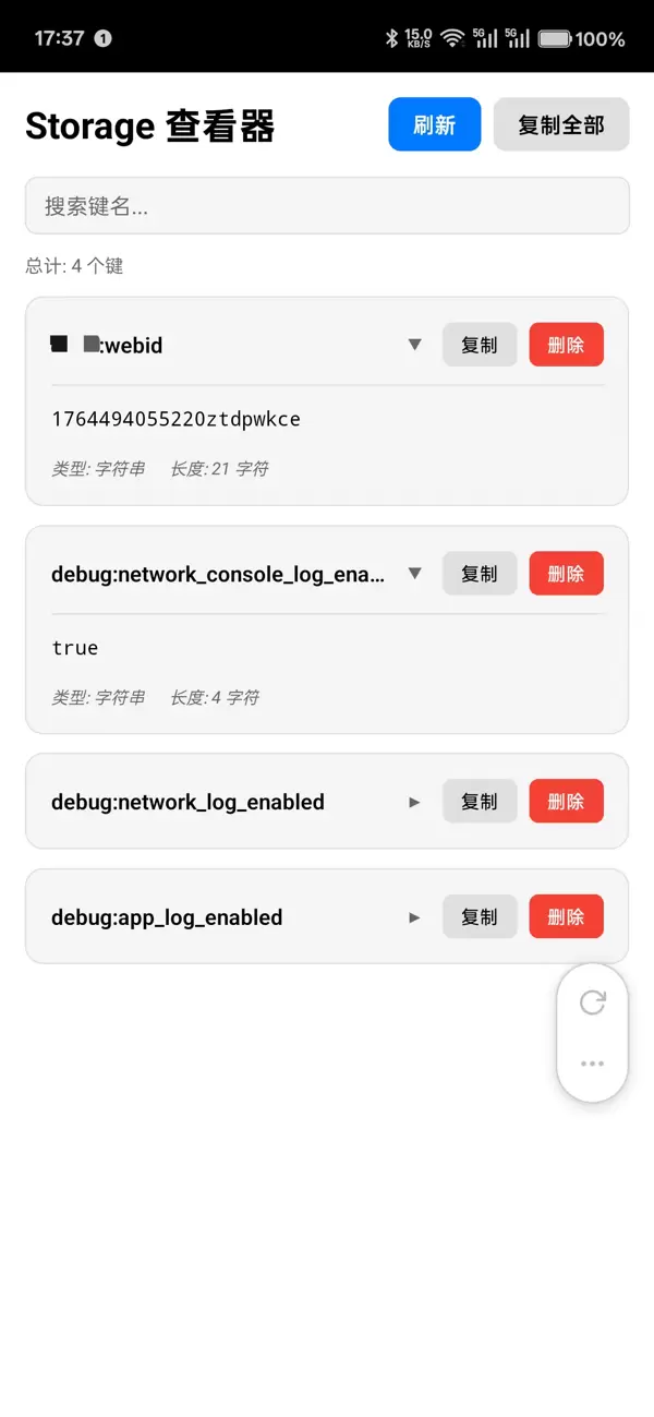 - 状态管理工具:支持查看全局状态、本地存储数据(如 AsyncStorage)、Redux 或其他状态容器中的内容。