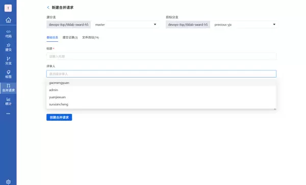 在创建合并请求时,系统默认将创建者设为评审人之一,同时也支持多选其他成员作为共同评审人。
