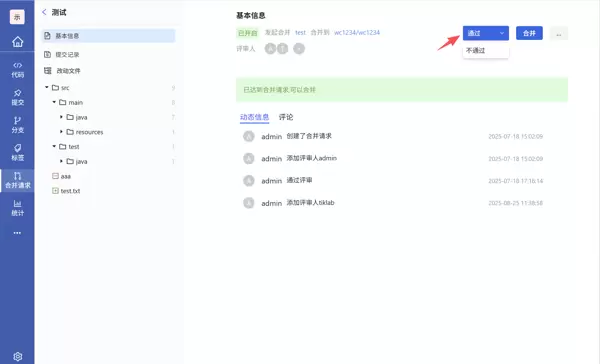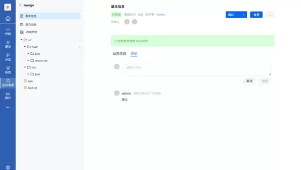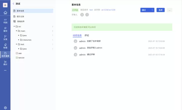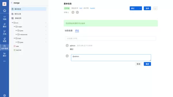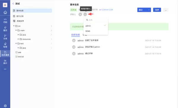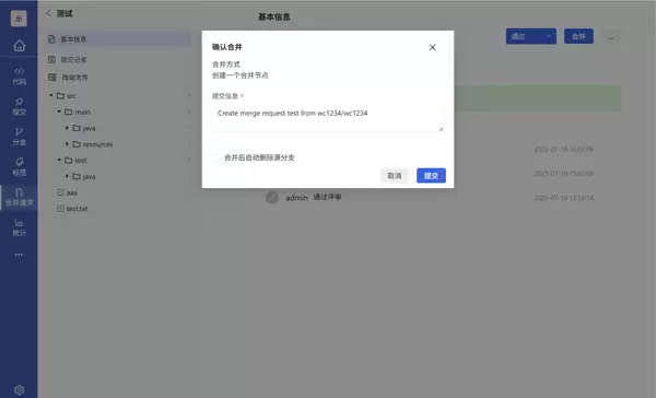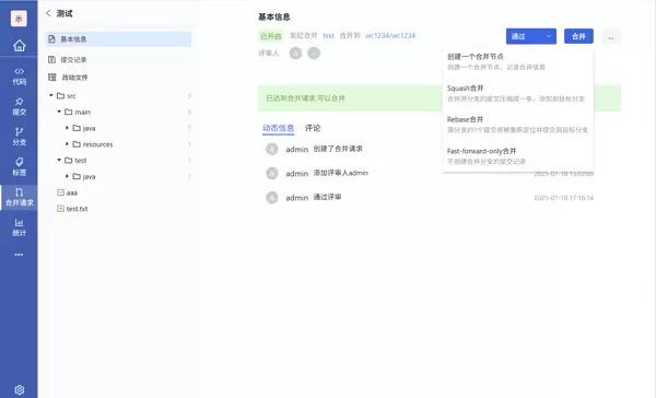 - 合并操作意为将源分支的更改合并至目标分支。用户需选择正确的源与目标分支,填写标题,指定评审人,最后点击“创建合并请求”完成提交。
