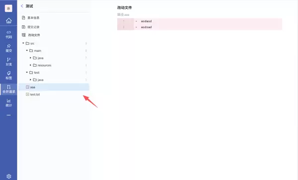 点击“文件改动”标签页,系统将列出所有被修改的文件。点击任一文件条目,即可查看该文件的具体变更内容。