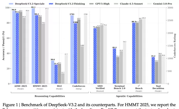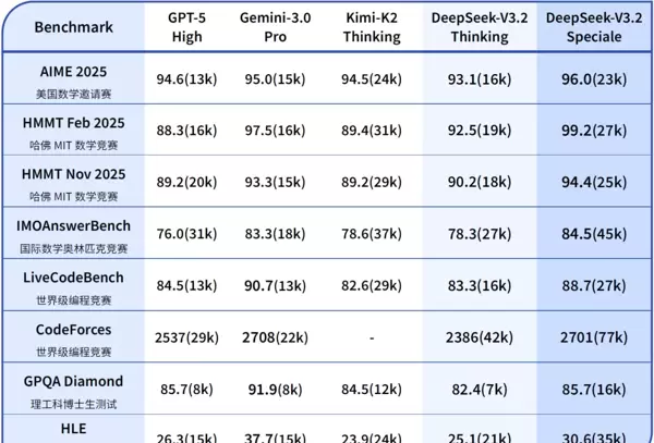 在多项关键基准测试中,DeepSeek-V3.2的表现已可媲美GPT-5(High)。更具说服力的是,其在IMO(国际数学奥林匹克)、IOI(国际信息学奥林匹克)等顶尖人类智力竞赛中夺得金牌,超越了单纯的“刷榜”行为,证明了其在应对极端复杂、前所未见问题时具备强大的深度推理能力。