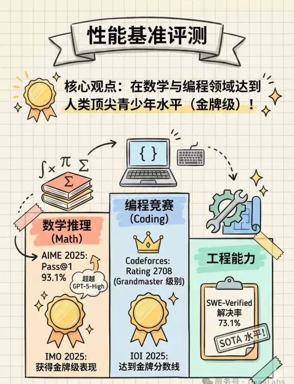 在数学推理方面,Speciale 表现出绝对的统治级实力,成功达到国际数学奥林匹克竞赛(IMO)2025 年金牌水平,展示了其在符号推理、定理证明与复杂建模方面的顶尖能力。