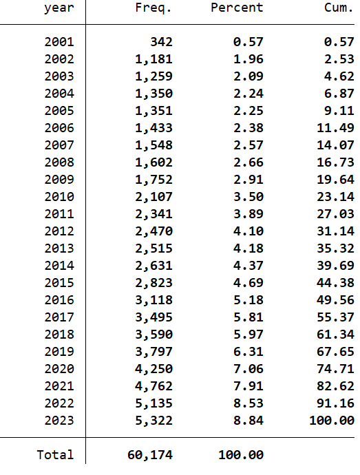 - 数据区间:2001 - 2023年