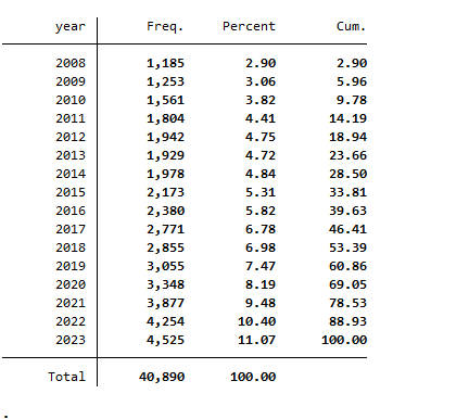 year 数值型 年份(2008-2023)