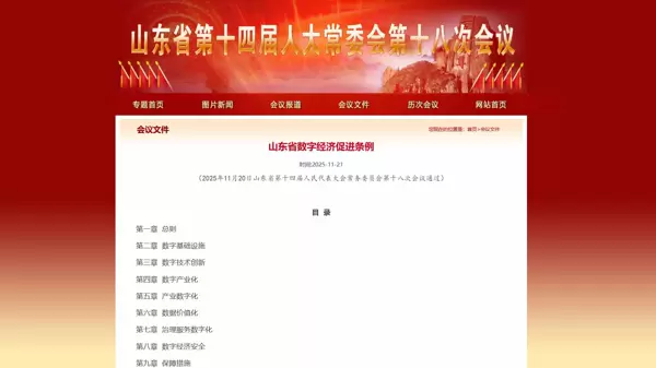 2025年11月20日,山东省第十四届人大常委会第十八次会议审议通过了《山东省数字经济促进条例》(以下简称《条例》),该法规将于2026年1月1日起正式实施。作为山东省在数字经济领域的首部专门性地方立法,《条例》共设10章63条,系统构建了数字经济发展所需的法治框架与发展路径,标志着山东数字经济由“高速增长”阶段迈向“规范提质”的新纪元,对推动实体经济与数字技术深度融合具有重要里程碑意义。